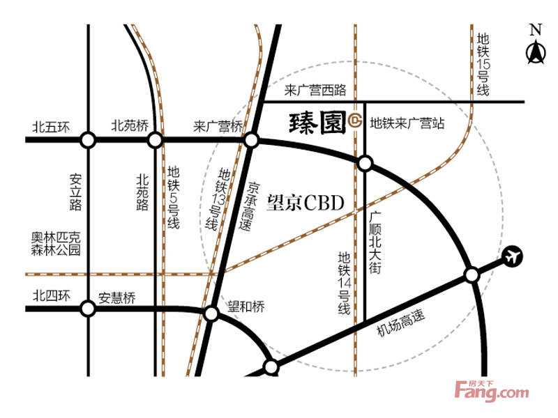 项目南邻北五环、北依来广营西路、东接广顺北大街、西邻京承高速,出行便捷,未来地铁14号线直达本案;北京朝来森林公园、望湖公园及北辰高尔夫球会、鸿华高尔夫俱乐部等高端生态配套环伺。
